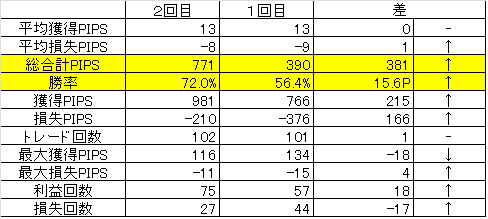 ちょっと改善。平均獲得pipsはもう少し下がるかなと思ってたけど変わらなかった。今回は損切りになる前にいかないかなあと思ったらサクサク切ってたんで。なので、前回に比べて1~10pips未満のトレードも多かったです。