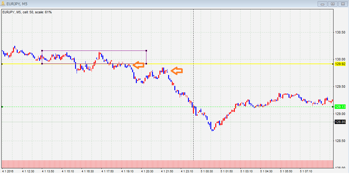 ②大きい時間足と逆の方にブレイクした場合は騙しの可能性が高いのではないか、騙しではない場合転換部分になるかもしれない?